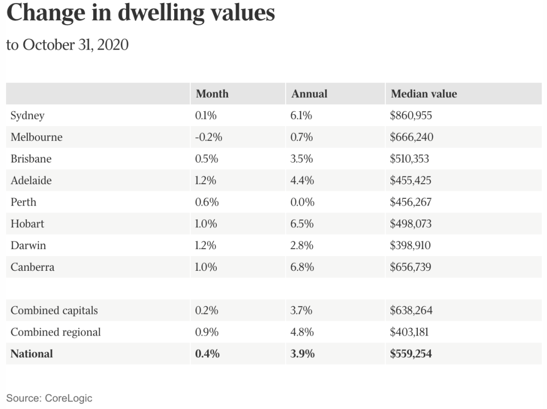 不過根據(jù)地產(chǎn)研究機(jī)構(gòu)CoreLogic最新的數(shù)據(jù)顯示:自疫情爆發(fā)以來,澳洲房?jī)r(jià)首次出現(xiàn)了整體上漲,10月份澳洲全國(guó)住宅房產(chǎn)價(jià)格整體上漲了0.4%,中位價(jià)達(dá)到559254澳元。除了遭受第二波疫情的墨爾本房?jī)r(jià)仍有小幅下降之外,其他首付城市房?jī)r(jià)均在上漲。業(yè)內(nèi)專業(yè)人士稱,各種數(shù)據(jù)表明澳洲房市或以觸底。