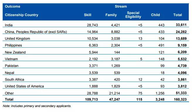 2018-19財年澳洲總共發(fā)出160,323個永居簽證,同比2017-18財年減少了2094個;