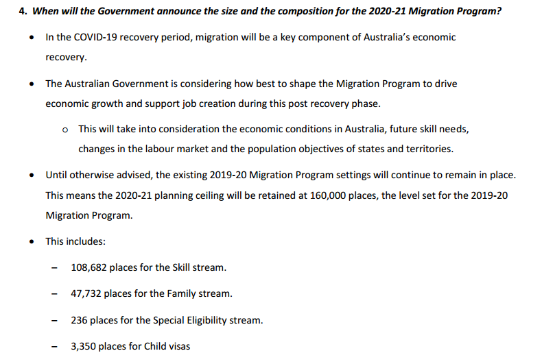 澳洲移民局同時(shí)公布了2020-2021財(cái)年澳洲移民計(jì)劃Q&A,針對(duì)大家關(guān)注的移民配額、州擔(dān)保發(fā)放、EOI邀請(qǐng)以及未來(lái)澳洲移民前景等相關(guān)問(wèn)題一一作了解答。