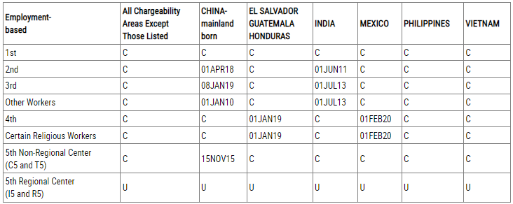 根據(jù)職業(yè)移民簽證排期表A,對于中國大陸出生的申請人,EB-1、EB-4類別繼續(xù)維持無排期狀態(tài);EB-2類別排期為2018年4月1日,前進(jìn)4個月;EB-3類別排期為2019年1月8日,前進(jìn)7天;EB-5直投類別排期為2015年11月15日,前進(jìn)7天;EB-5區(qū)域中心類別顯示“U”,因法案暫停暫無簽證名額可用。
