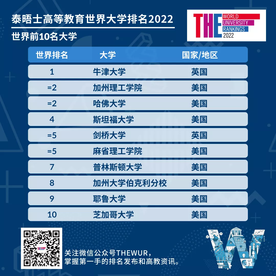9月2日,泰晤士高等教育(Times Higher Education,THE)發(fā)布了2022年度世界大學(xué)排名。共有來(lái)自99個(gè)國(guó)家和地區(qū)的1662所大學(xué)上榜,其中,英國(guó)牛津大學(xué)連續(xù)第六年蟬聯(lián)榜首。加州理工學(xué)院和哈佛大學(xué)并列世界第二名,斯坦福大學(xué)位列第四,劍橋大學(xué)以及麻省理工學(xué)院并列世界第五。今年,來(lái)自中國(guó)內(nèi)地的10所高校躋身200強(qiáng),創(chuàng)歷史紀(jì)錄。其中清華大學(xué)和北京大學(xué)并列全球第16名,位列亞洲地區(qū)第一。