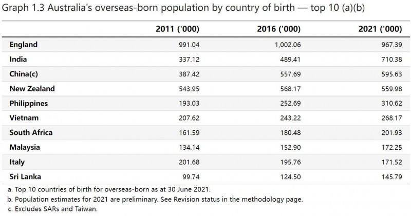 統(tǒng)計(jì)局公布榜單顯示,2021年,全澳排名前三的移民群體分別是英國(guó)、印度和中國(guó)。