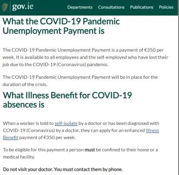 愛爾蘭福利局為所有因疫情而失去收入的員工或自雇人士每人每周發(fā)放350歐元,共計發(fā)放6周的基本補助金。申請該補助不會對簽證造成影響。社會保障部部長Regina Doherty表示已經(jīng)處理了超過40,000份失業(yè)救濟金的申請,將在下周支付給申請者。