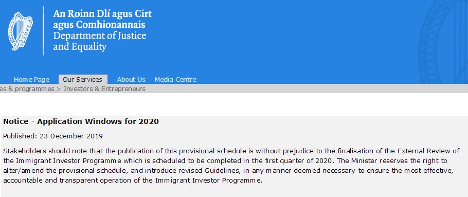愛爾蘭司法部在12月23日發(fā)布通告,公布了2020年愛爾蘭投資移民申請(qǐng)的遞交窗口期及其他相關(guān)注意事項(xiàng)。我們將在下文為大家一一解讀。