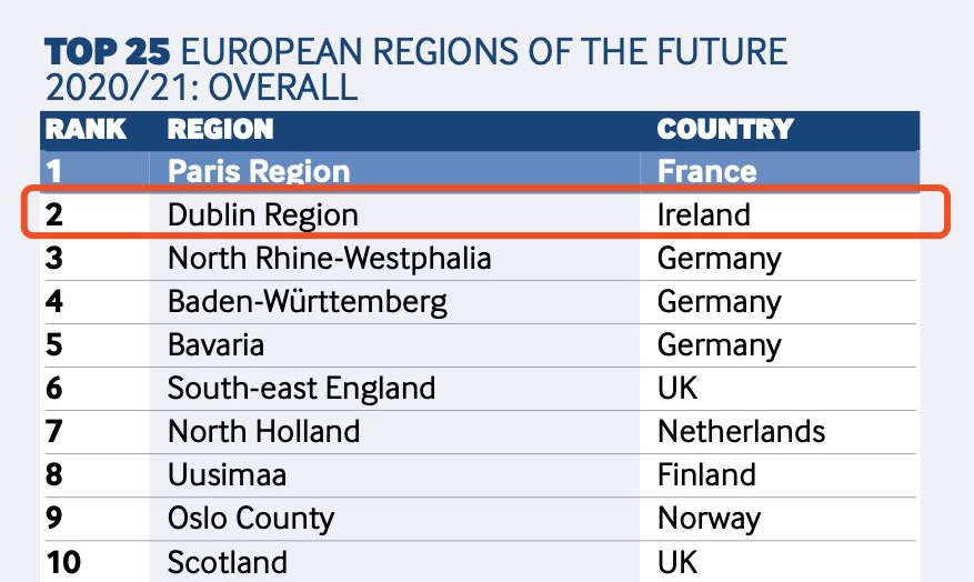 據(jù)最新發(fā)布的《2020/21歐洲未來(lái)城市和地區(qū)》排名顯示,都柏林地區(qū)在“歐洲最佳投資地區(qū)”排名中榮獲第二名,被列為外國(guó)直接投資首選地區(qū)之一。