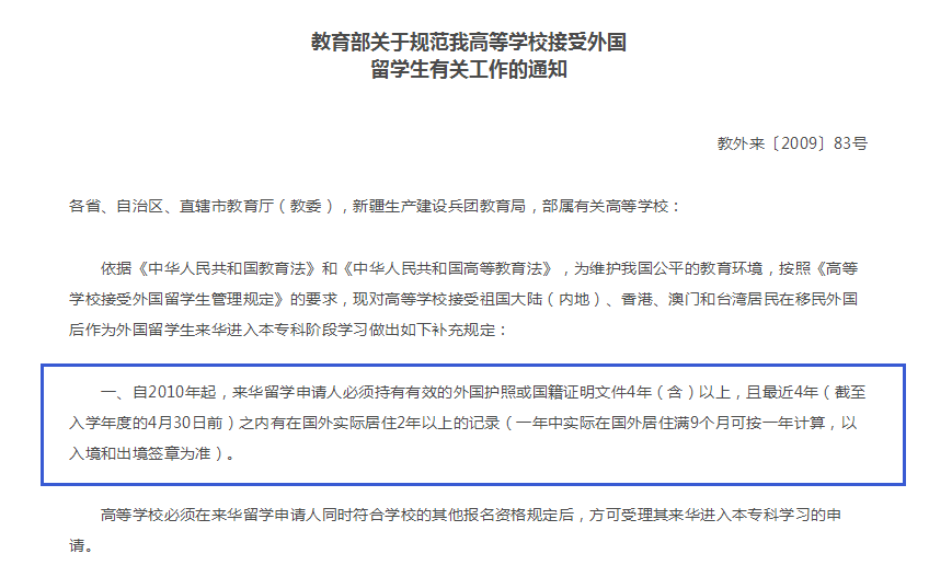 二、對(duì)祖國(guó)大陸(內(nèi)地)、香港、澳門(mén)和臺(tái)灣居民在移民并獲得外國(guó)國(guó)籍后,申請(qǐng)作為國(guó)際學(xué)生進(jìn)入我高等學(xué)校本??齐A段學(xué)習(xí)的,除符合學(xué)校的其他報(bào)名資格外,仍須持有有效的外國(guó)護(hù)照或國(guó)籍證明文件4年(含)以上,且最近4年之內(nèi)有在外國(guó)實(shí)際居住2年以上的記錄。