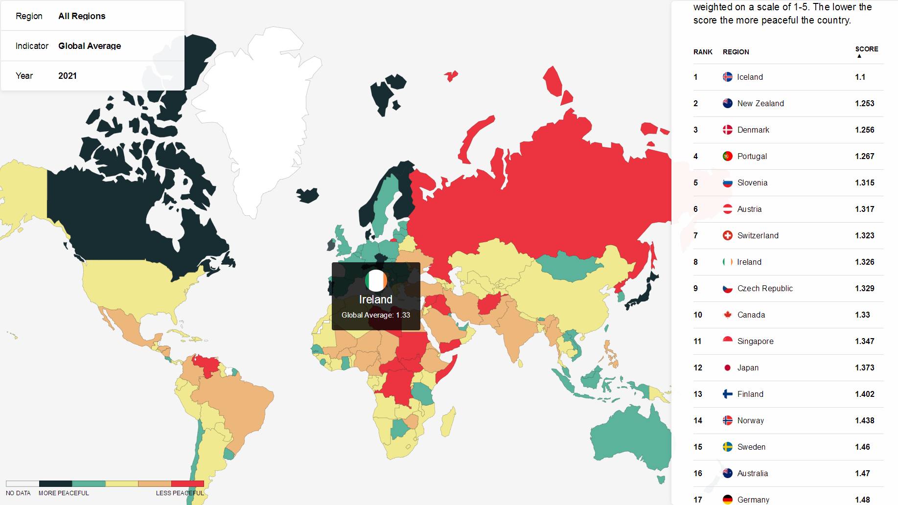 2021年,冰島再次蟬聯(lián)全球最和平國(guó)家,新西蘭、丹麥緊隨其后,分獲第2、第3名。對(duì)比2020年排名,新加坡跌出前十,愛爾蘭前進(jìn)3位取而代之。此外,日本排名第12,澳大利亞排名16,英國(guó)排名33,而美國(guó)排在第122名。
