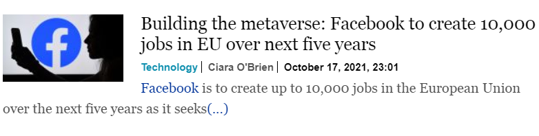 據(jù)《愛爾蘭時(shí)報(bào)》報(bào)道,未來五年內(nèi),美國社交媒體巨頭Facebook將在歐盟范圍內(nèi)創(chuàng)造1萬個(gè)新的高技能工作崗位,以推動(dòng)開發(fā)“元宇宙”(Metaverse),其中部分就業(yè)崗位將劃分給其位于愛爾蘭都柏林的歐洲總部。