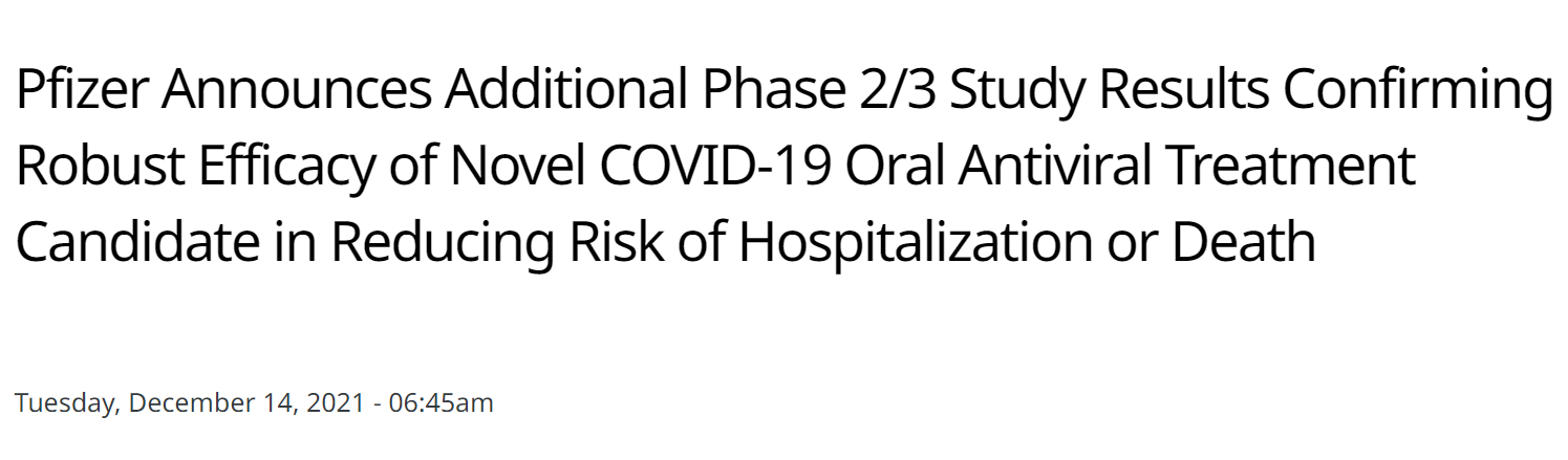 美國(guó)時(shí)間12月14日,輝瑞制藥(Pfizer) 公布了其新冠口服抗病毒藥物PAXLOVID的最終臨床分析結(jié)果,證實(shí)PAXLOVID在降低住院或死亡風(fēng)險(xiǎn)方面具有強(qiáng)大的療效,且該口服藥對(duì)快速傳播的奧密克戎變體也仍然有效。