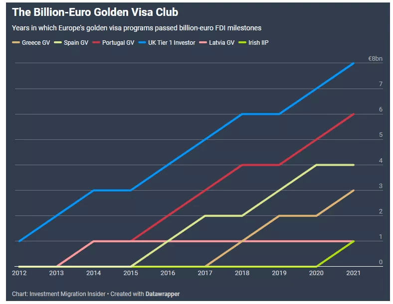 隨著愛爾蘭投資移民項目(Irish IIP)2021年累計投資額超過10億歐元,歐洲10億歐元黃金簽證“俱樂部”的數(shù)量已經(jīng)達到了六個。分別是:英國投資者簽證、葡萄牙黃金簽證、西班牙黃金簽證、希臘黃金簽證、拉脫維亞黃金簽證和愛爾蘭投資移民簽證。
