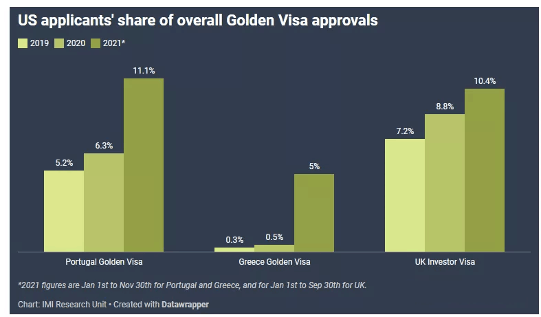 今年截至11月底,美國申請人占葡萄牙黃金簽證申請總?cè)藬?shù)的11.1%,占比相較2020年幾乎翻了一番;占希臘黃金簽證申請總?cè)藬?shù)的5%,占比相較2020年更是翻了10倍。今年截至9月底,美國申請人占英國投資者簽證總量的10.4%,同樣處于穩(wěn)步上升趨勢。