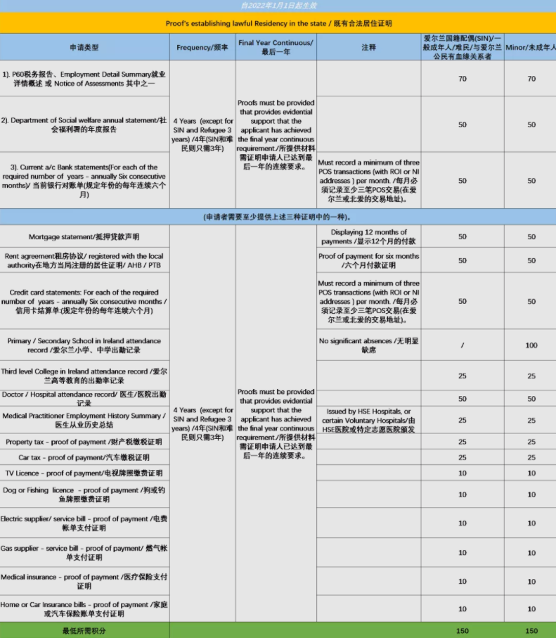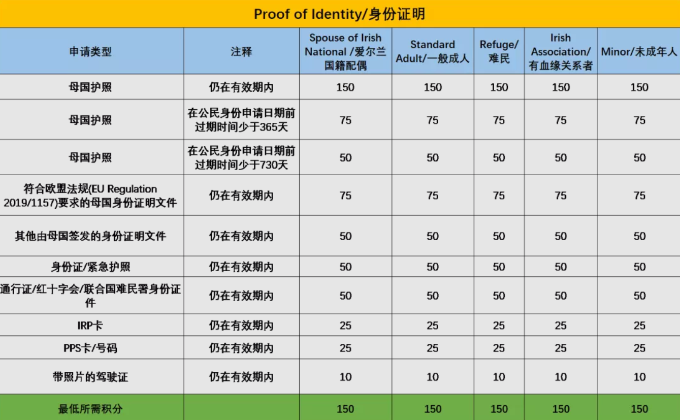 積分制的引入,使申請(qǐng)人更加明確需提供哪些文件證明,以成功獲取公民身份。根據(jù)愛爾蘭移民局官網(wǎng)公布的積分細(xì)則,申請(qǐng)者需要在身份認(rèn)證(Identity)和居住證明(Residency)兩方面均滿足每年150分的積分要求。