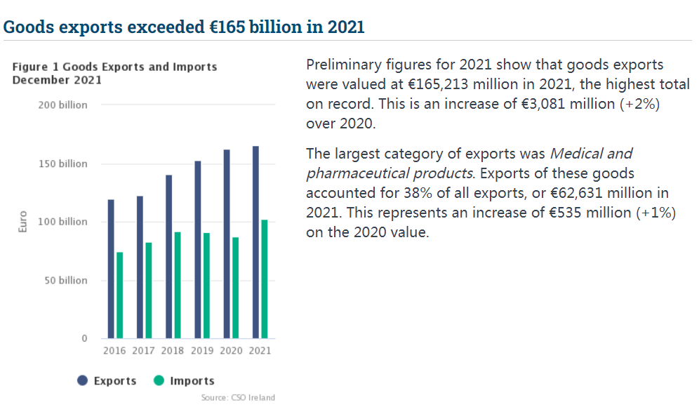 愛(ài)爾蘭中央統(tǒng)計(jì)局(CSO)最新數(shù)據(jù)顯示:繼2020年愛(ài)爾蘭出口額達(dá)到創(chuàng)紀(jì)錄的1620億歐元(比2019年增長(zhǎng)6.6%)后,2021年愛(ài)爾蘭的出口總額又創(chuàng)下新紀(jì)錄,達(dá)到1652億歐元,同比增長(zhǎng)2%。
