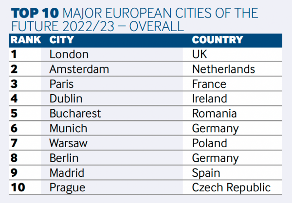 2月17日,《金融時(shí)報(bào)》旗下的《FDi Intelligence》發(fā)布最新《2022-2023年度歐洲未來城市和地區(qū)》報(bào)告,通過評估歐洲356個(gè)城市和148個(gè)地區(qū),倫敦、阿姆斯特丹、巴黎、都柏林和布加勒斯特名列前茅,被評為歐洲五大最具投資價(jià)值城市。