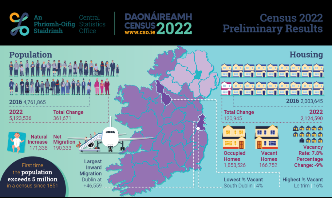 愛(ài)爾蘭中央統(tǒng)計(jì)局(CSO)6月中旬公布了《2022人口普查報(bào)告》初步數(shù)據(jù)。報(bào)告顯示:截至2022年4月3日的普查日,愛(ài)爾蘭總?cè)丝谠鲩L(zhǎng)至512萬(wàn)3536人,這是自1841年人口普查以來(lái),錄得的最高數(shù)據(jù),也是自1851年以來(lái)首次突破500萬(wàn)大關(guān)。