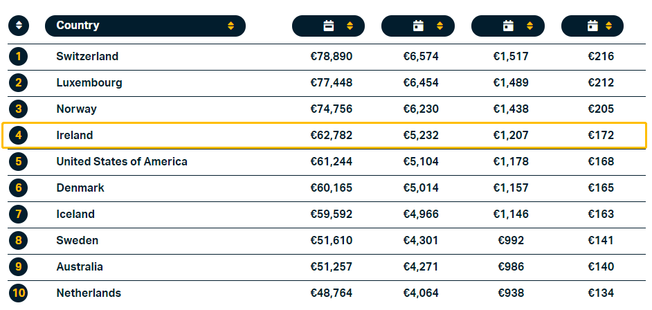 科技公司Tipalti的最新研究結(jié)果顯示,愛(ài)爾蘭是全球最適合工作和創(chuàng)造財(cái)富的國(guó)家之一。在全球近40個(gè)參與評(píng)比的國(guó)家和地區(qū)中,愛(ài)爾蘭“財(cái)富得分”6.89分,位列第8名。愛(ài)爾蘭平均年薪62,782歐元(約合人民幣43.2萬(wàn)元),超越美國(guó)。
