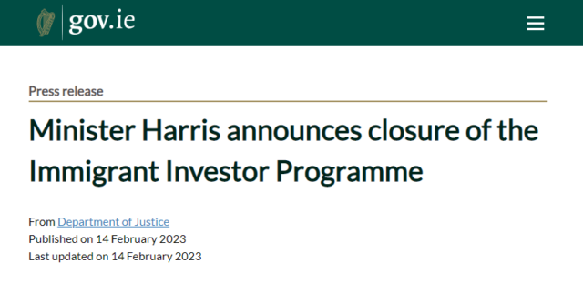 當(dāng)?shù)貢r(shí)間2月14日,愛爾蘭司法部重磅官宣:愛爾蘭投資移民計(jì)劃(IIP)于2023年2月15日工作日結(jié)束后正式關(guān)停。