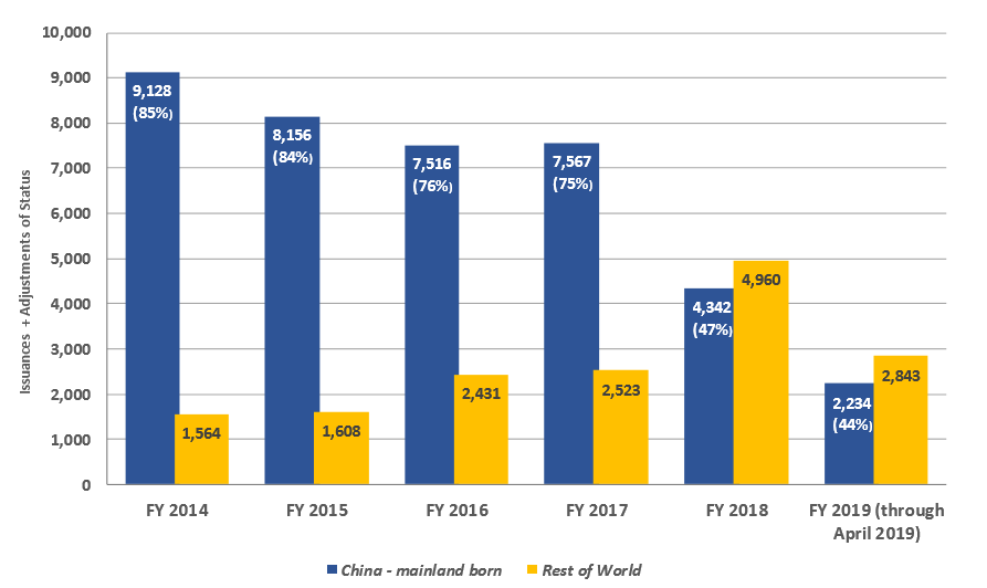 自2015財(cái)年中國(guó)大陸EB-5申請(qǐng)人開(kāi)始出現(xiàn)排期后,2015財(cái)年中國(guó)大陸出生的申請(qǐng)人占用了8,156個(gè)簽證名額(占全球84%),2016財(cái)年為7,516個(gè)(占全球76%),2017財(cái)年為7,567個(gè)(占全球75%),2018財(cái)年為4,342個(gè)(占全球47%),截止到2019年4月份中國(guó)大陸僅分配了2234個(gè)簽證名額(占全球44%)。