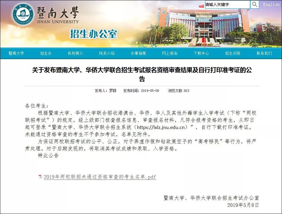 5月8日,暨南大學(xué)招生辦公室網(wǎng)站上發(fā)布公告,稱根據(jù)暨南大學(xué)、華僑大學(xué)聯(lián)合招收港澳臺(tái)、華僑、華人及其他外籍學(xué)生入學(xué)考試(下稱“兩校聯(lián)招考試”)的規(guī)定,經(jīng)上級(jí)部門核查報(bào)名信息、審查報(bào)名材料,未能通過(guò)資格審查的考生將不予參加考試。