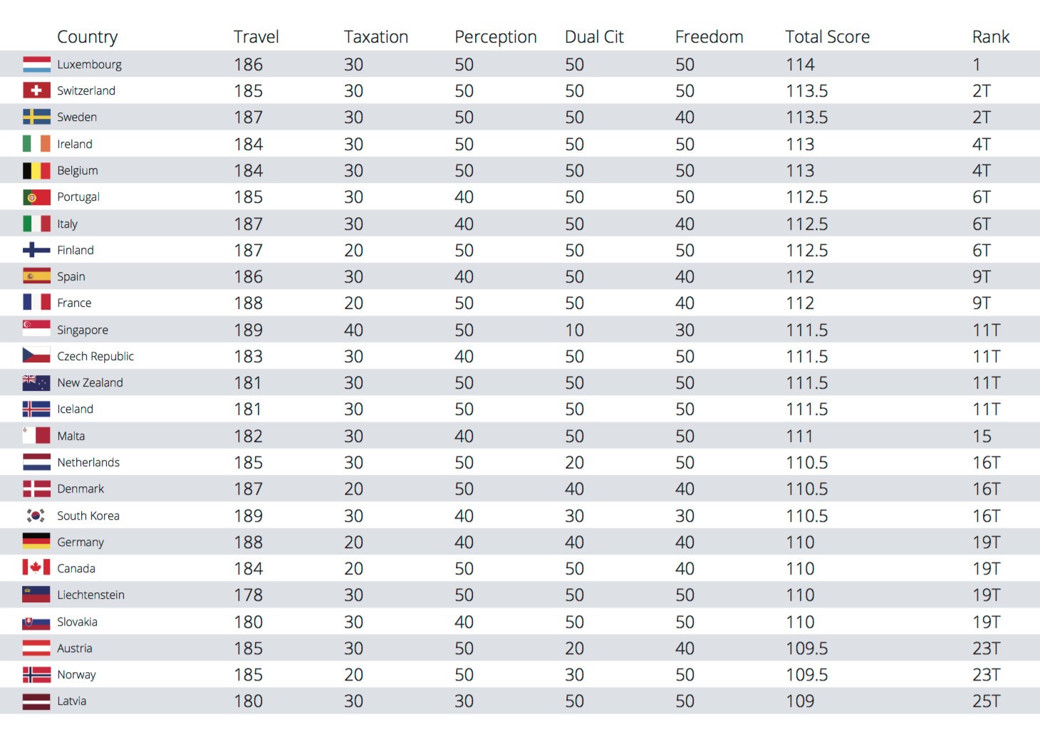 該排名中盧森堡奪魁,前十名均是歐洲國(guó)家,前二十名除了新加坡、新西蘭、加拿大和韓國(guó),也均為歐洲國(guó)家。其中第二名是瑞士,第三名瑞典,第四名愛(ài)爾蘭,第五則為比利時(shí)。中國(guó)排名第130。