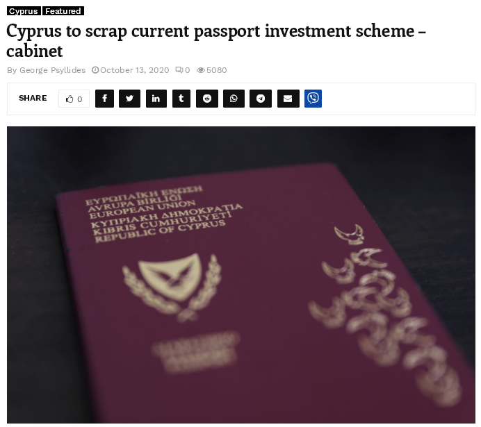 當(dāng)?shù)貢r間10月13日,據(jù)塞浦路斯郵報消息,塞浦路斯將廢除目前的護(hù)照投資項目。