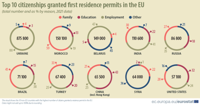 歐盟統(tǒng)計(jì)局發(fā)布的最新報告顯示,2021年歐盟向非歐盟國家公民簽發(fā)了近300萬張首次居留許可,簽發(fā)量與2020年相比飆升31%,重回疫情前2019年水平。