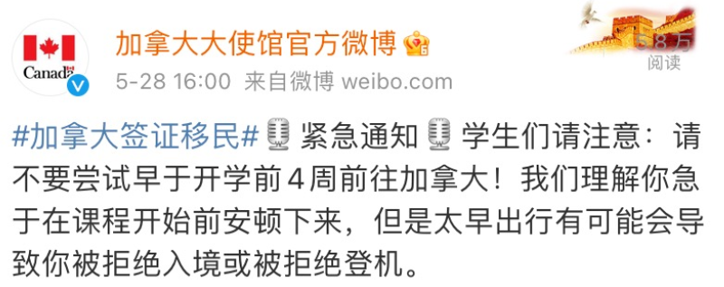加拿大駐華使館緊急發(fā)布最新提醒:留學(xué)生請(qǐng)勿早于開學(xué)前四周抵達(dá)加拿大,極有可能被海關(guān)拒絕入境或被拒絕登機(jī)!如果9月7日開學(xué),那么往前回溯四周28天,則不要預(yù)定早于8月10日抵達(dá)加拿大的航班。