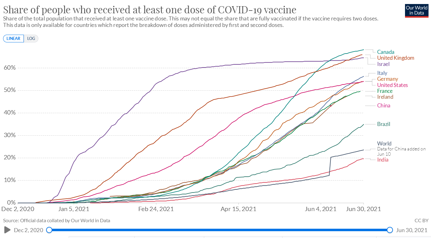 今年年初,加拿大疫苗接種速度還備受詬病,而4月以來,加拿大疫苗接種速度仿佛突然蘇醒一般,飛速提升,一舉逆襲英國、美國、以色列,穩(wěn)坐世界第一!
