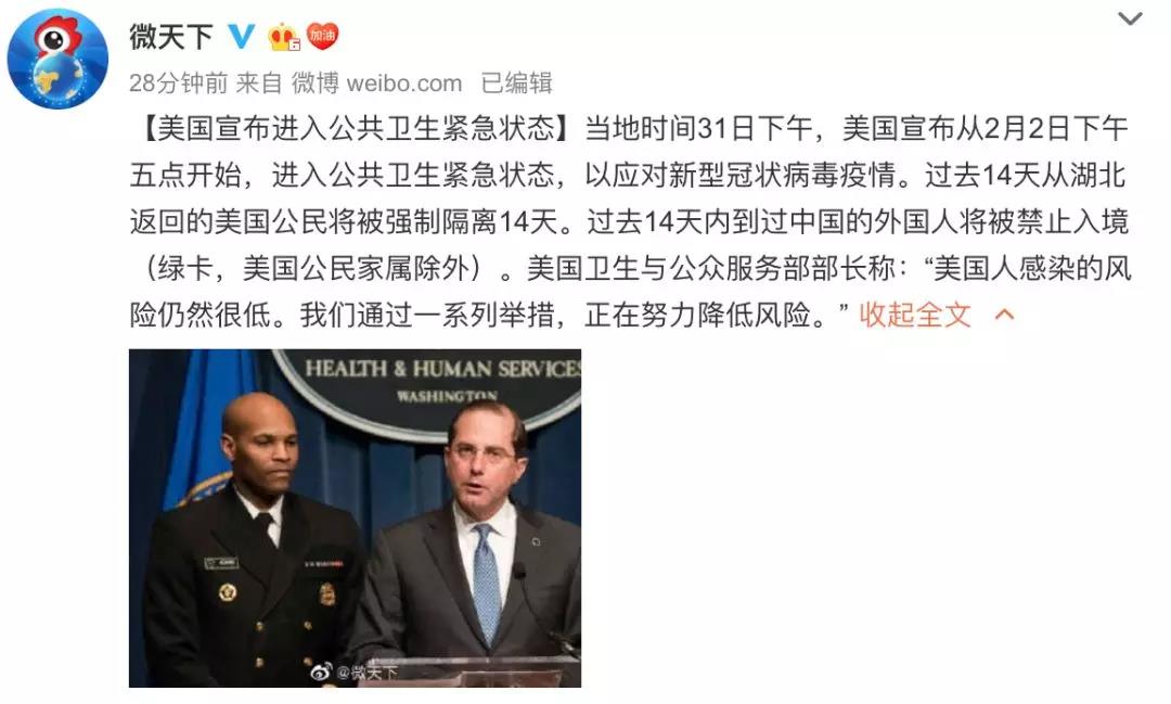 同時,從2月2日開始,任何在過去14天內到過中國湖北省的美國公民入境美國時,都將被強制隔離14天。