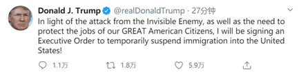 特朗普在推特上寫(xiě)道,“鑒于‘這個(gè)看不見(jiàn)的敵人’(指新冠病毒)的攻擊,以及保護(hù)我們偉大的美國(guó)公民的工作需要,我將簽署一項(xiàng)行政命令,暫停移民入境美國(guó)!”