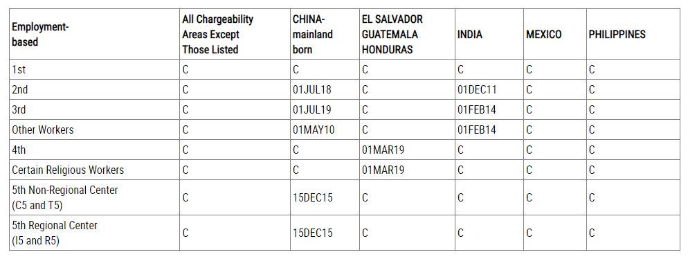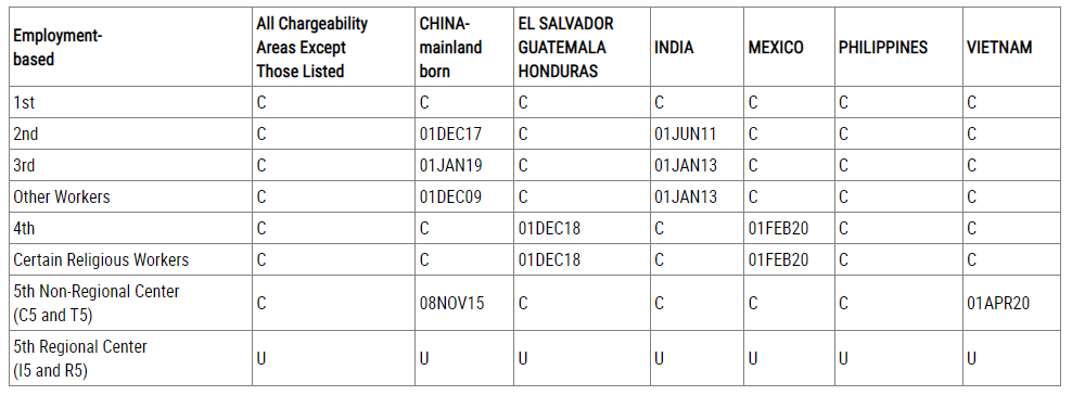 職業(yè)移民表A:EB-2前進7個月,EB-3前進4個月,EW-3(Other Workers,非技術(shù)移民)前進2個月,EB-5非區(qū)域中心前進54天。