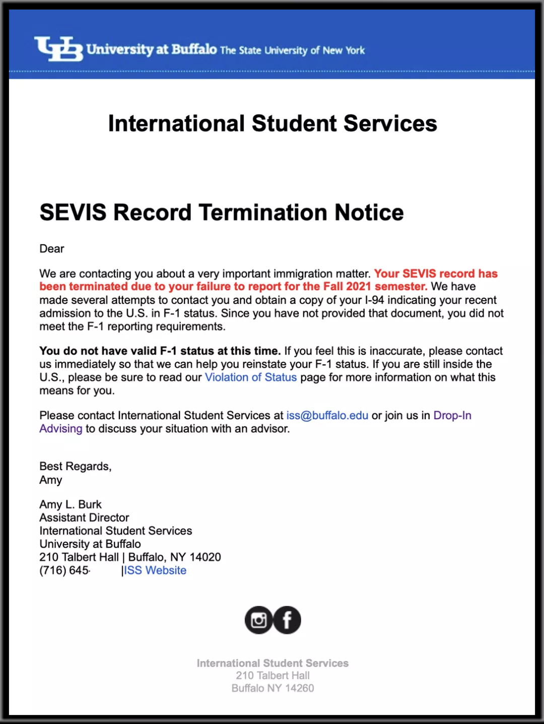 今年9月28日,紐約州立大學(xué)布法羅(SUNY Buffalo)分校的多名留學(xué)生,其中包括至少30名中國留學(xué)生,收到校方郵件通知:由于學(xué)生未能在開學(xué)一個月的時間內(nèi),向?qū)W校的國際學(xué)生事務(wù)辦公室報到,并遞交I-94副本,校方不再認可其留學(xué)生身份,根據(jù)美國相關(guān)的移民法律,這些學(xué)生的F-1簽證將被終止,并須盡快離境!