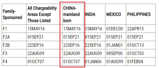 ·親屬移民排期表B,F(xiàn)2A類(lèi)別前進(jìn)了92天至2021年9月1日,其他類(lèi)別無(wú)變化。