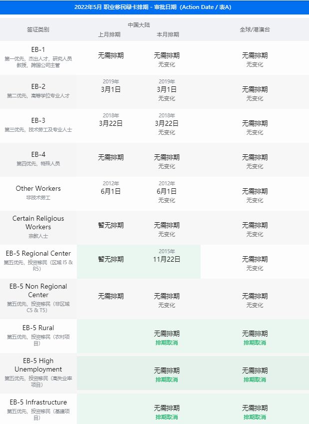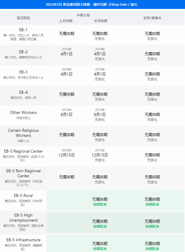 美國5月綠卡排期出爐