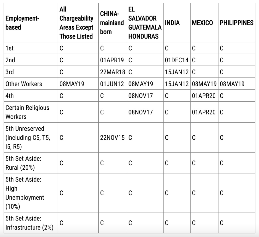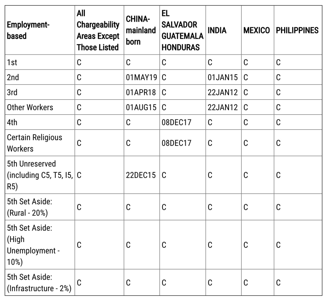 ·表B同樣除EB-2前進(jìn)1個月至2019年5月1日,其他各類簽證項目排期無變化。