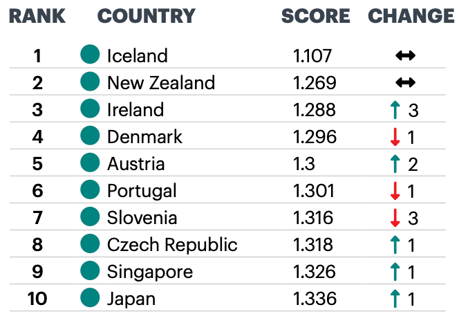 《2022全球和平指數(shù)》排名前十國家分別為:冰島、新西蘭、愛爾蘭、丹麥、奧地利、葡萄牙、斯洛文尼亞、捷克、新加坡和日本。