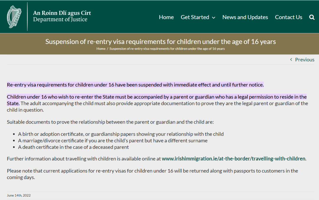6月14日,愛爾蘭司法部門和移民局發(fā)布通知稱,取消對(duì)16歲以下兒童再次入境愛爾蘭的簽證要求,并表示該規(guī)定立即生效,直至進(jìn)一步通知。