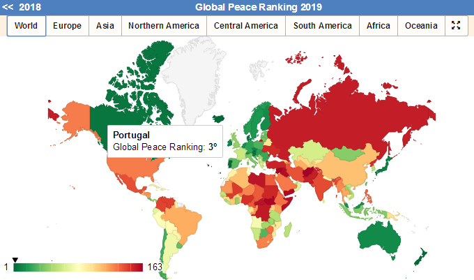該報(bào)告以社會安全、國內(nèi)國際沖突和軍事化程度為測量領(lǐng)域,依據(jù)23項(xiàng)定量或定性指標(biāo),對世界163個(gè)國家(覆蓋全。球99.7%人口)的和平狀況作出分析與排序。2019排在全球和平指數(shù)前五名的國家分別是:冰島、新西蘭、葡萄牙、奧地利和丹麥。