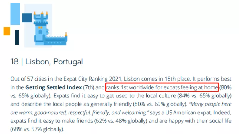 根據(jù)InterNations最新榜單,來(lái)自世界各地的受調(diào)外籍人士中,80%認(rèn)為里斯本給他/她們像家一樣的感覺(jué),遠(yuǎn)遠(yuǎn)超過(guò)全球平均水平65%,穩(wěn)居最有歸屬感城市第一名!