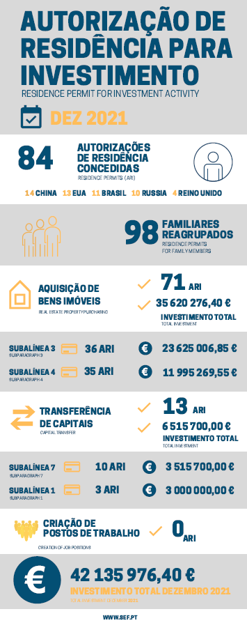 近日,葡萄牙移民局(SEF)公布了2021年12月的黃金簽證數(shù)據(jù)。2021年12月,共有84位主申請人和98位附屬申請人獲批葡萄牙黃金簽證。其中,來自中國的主申請人為14位,排名第一。其次是美國(13位)、巴西(11位)、俄羅斯(10位)、英國(4位)。