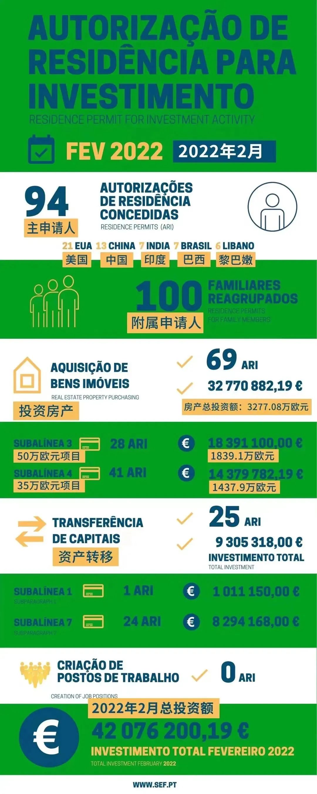 日前,葡萄牙移民局官網(wǎng)公布了2022年2月的黃金簽證數(shù)據(jù)。今年2月,共有94位主申請人連同他們的100位家屬獲得了葡萄牙黃金簽證。這一數(shù)據(jù),與今年1月持平,獲批人數(shù)維持穩(wěn)定。2月總投資額為4208萬歐元。
