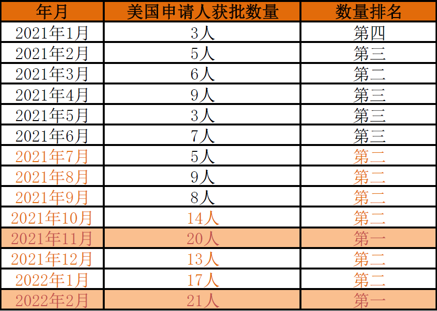 ·2021年11月,美國獲批申請人數(shù)量首次超過中國,排名當(dāng)月第一;