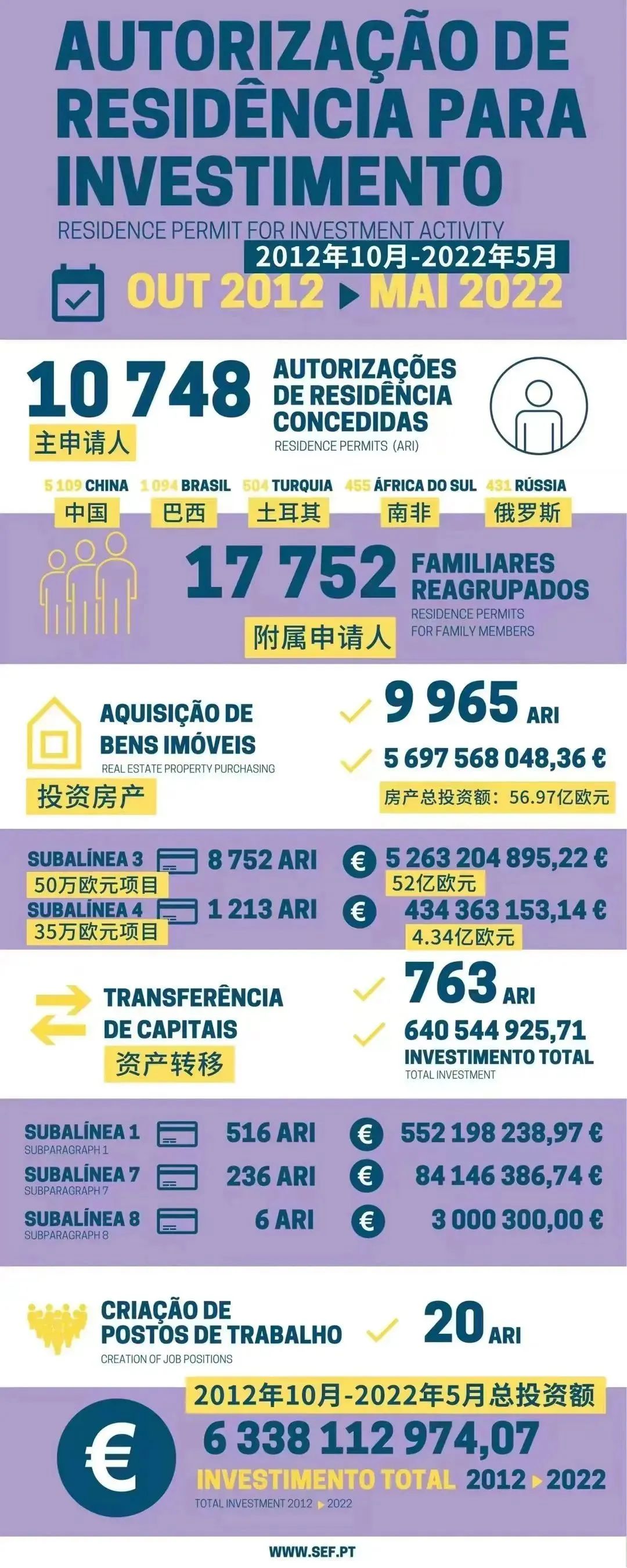 葡萄牙移民局也再次更新了2012年10月黃金居留政策推行以來的整體數(shù)據(jù),數(shù)據(jù)顯示,10年來,已有10748位主申請人獲批葡萄牙黃金簽證,其中中國家庭為5109組,占比約50%,可見中國投資者對葡萄牙項目的喜愛和認可。通過黃金簽證計劃,葡萄牙共吸納了63.38億歐元投資,其中56.97億資金直接投資于房地產市場。