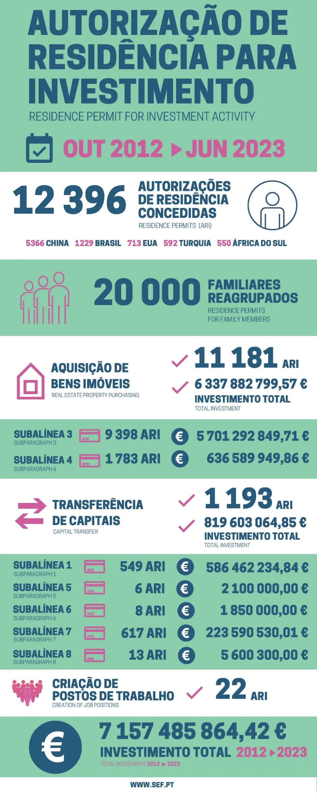 7月5日葡萄牙移民局(SEF)公布了2023年6月份的黃金簽證數(shù)據(jù)。6月共有179位主申請(qǐng)人和192位附屬申請(qǐng)人獲批葡萄牙黃金簽證。獲批總?cè)藬?shù)為371人,總投資額約7988萬(wàn)歐元。