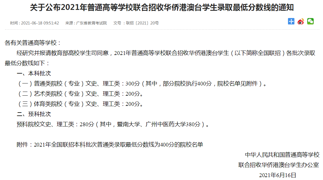 預(yù)科院校文史、理工類:280分(其中,暨南大學(xué)、廣州中醫(yī)藥大學(xué)380分)。
