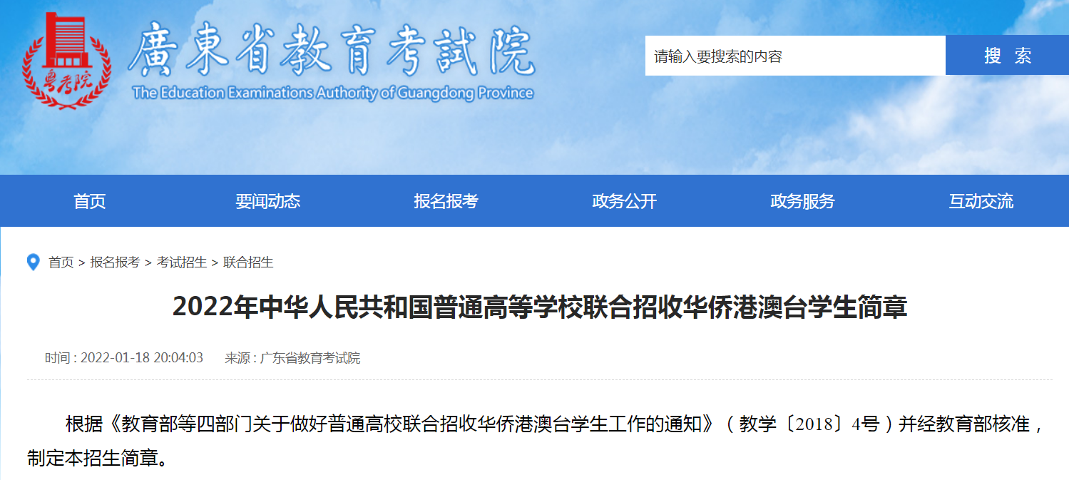2022年1月18日,廣東省教育考試院發(fā)布了《2022年中華人民共和國普通高等學校聯合招收華僑港澳臺學生簡章》。那么,2022年華僑港澳臺學生全國聯招的報名條件、報名時間、考試科目、考試時間地點及志愿填報是怎樣的?下面我們一起來了解一下。