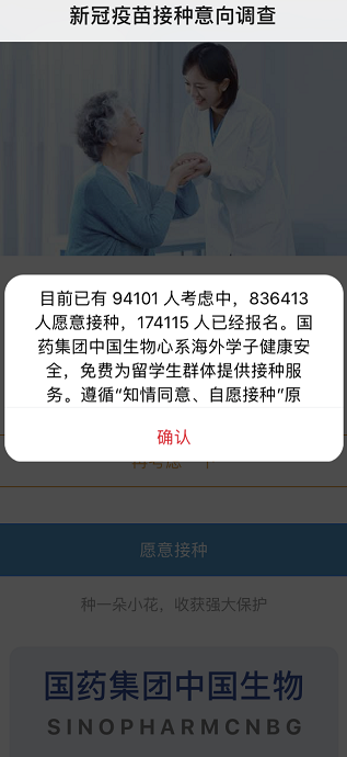 不過,查詢國藥集團(tuán)官網(wǎng)暫未發(fā)現(xiàn)報(bào)名通道,同時(shí)有公開報(bào)道顯示,一款“新冠疫苗接種預(yù)約”(新冠疫苗接種意向調(diào)查)的小程序在不久前的2020年中國國際服務(wù)貿(mào)易交易會(huì)上已經(jīng)亮相國藥集團(tuán)中國生物展臺(tái)。以上該款小程序的調(diào)查結(jié)果顯示,截至目前,已經(jīng)有接近40萬人表示“愿意接種”,并有超過7萬人已經(jīng)報(bào)名接種。該款小程序上還顯示,將免費(fèi)為留學(xué)生群體提供接種服務(wù)。