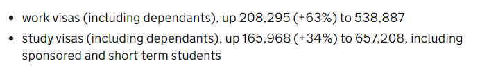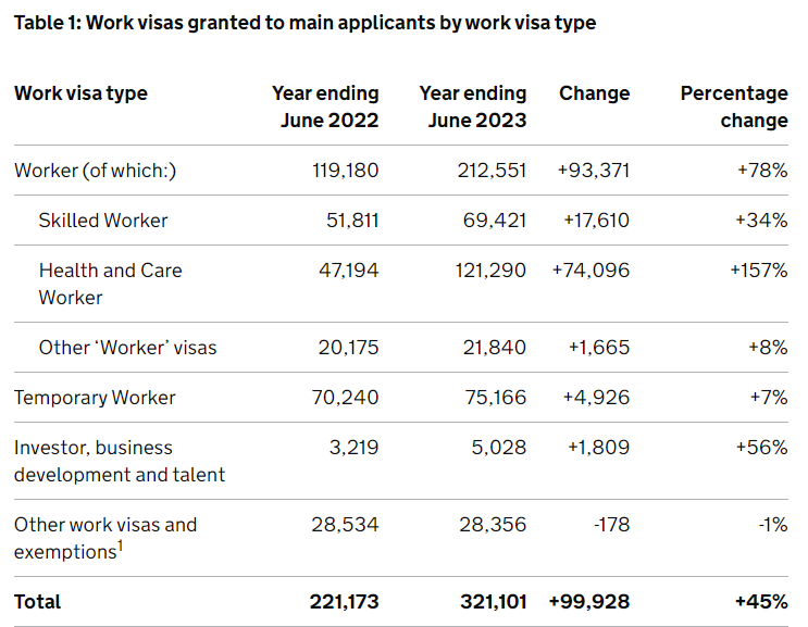 如果算上家屬,英國發(fā)放的工作類簽證甚至達到約54萬份,同比增長63%,相比2022年同期多出超20萬份。